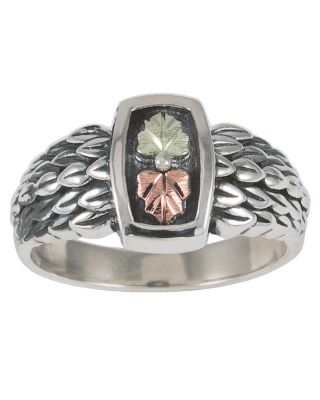 Unique sterling silver leaf band is the backdrop for simple elegance with 12K Black Hills Gold leaves taking center stage in this ring for her by Coleman. Sterling silver 12K Black Hills Gold rose and green leavesOxidized finishAvailable in sizes 510Made in USAPhoto may have been enlarged to show detail